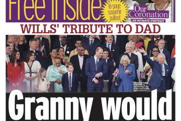 The Daily Express highlights Prince William’s touching words to his father at the coronation concert, featuring an image of the royals and guests dancing.