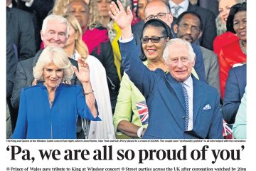The Daily Mail leads with Prince William’s heartfelt tribute to his father during his speech at the coronation concert.