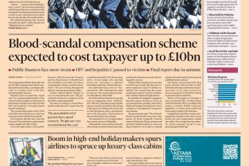The Financial Times notes the government could face an estimated £10bn compensation bill over the infected blood scandal, adding stress to public finances.