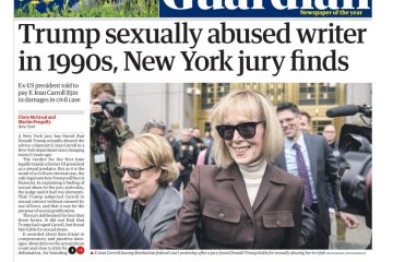 The Guardian’s lead story focuses on Donald Trump losing a civil case in which a jury determined he sexually abused a woman.