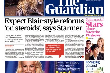 The Guardian leads with Labour leader Sir Keir Starmer’s upcoming speech, where he’ll call for a more radical approach than Tony Blair’s government due to the UK’s crisis.