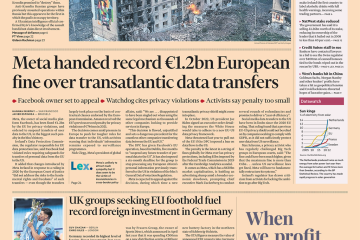 The Financial Times leads with the news of an unparalleled fine imposed on Meta, the parent company of Facebook.