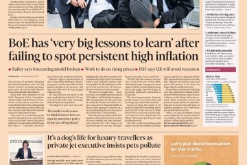 The front page of the Financial Times highlights a climate protester being escorted away from Shell’s disrupted annual meeting.