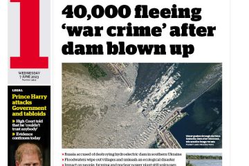 The i paper reports that 40,000 are fleeing an ecological crisis in southern Ukraine, linked to Russia’s alleged destruction of a dam.