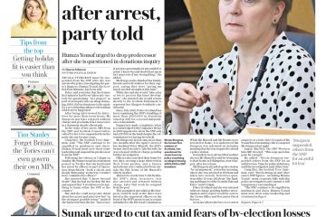 The Daily Telegraph highlights that Humza Yousaf, leader of the SNP, is under pressure to suspend Nicola Sturgeon following her recent arrest.