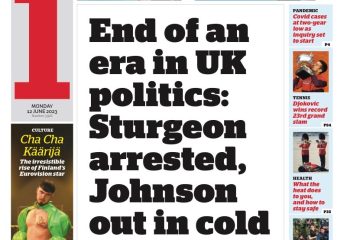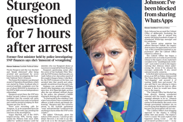 The Times covers the arrest and subsequent seven-hour questioning of Nicola Sturgeon regarding the police investigation into the financial affairs of the SNP.