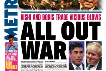 Metro headlines discuss the escalating conflict between Rishi Sunak and Boris Johnson over Johnson’s resignation honours list.