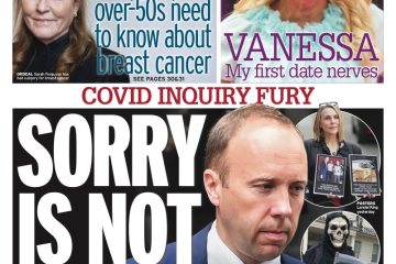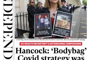 The Daily Mirror reports that Covid victims’ grieving relatives rejected Matt Hancock’s apology offered at Tuesday’s inquiry.