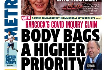 Metro’s lead story revolves around Matt Hancock’s statement at the Covid inquiry, asserting that procuring body bags took precedence over combating the virus for government officials.