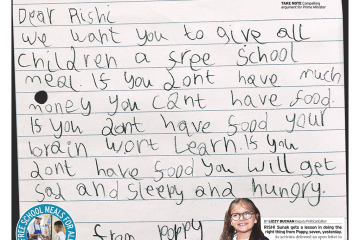The Daily Mirror features a story about a seven-year-old girl who has written a letter to the Prime Minister, calling for free school meals for all children.