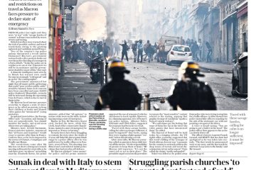 The Daily Telegraph highlights the potential travel curfews and restrictions for British travellers to France amid ongoing protests.