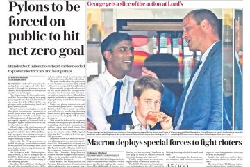 The Sunday Telegraph’s front page shows Prince George enjoying pizza at the second Ashes Test with Prince William and Rishi Sunak.