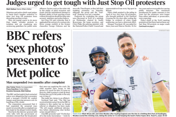 The Daily Telegraph notes the suspension of the BBC presenter entangled in a scandal involving explicit photographs and a teenager.