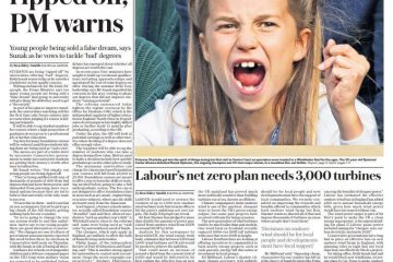 The Daily Telegraph carries Rishi Sunak’s view that many youths are falsely led to believe that university guarantees a decent job.