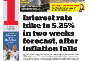 The i paper suggests that economists now foresee a Bank of England interest rate hike to 5.25% next month, in response to the new inflation figures.