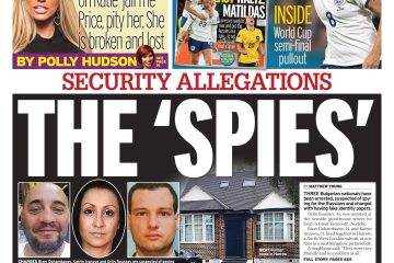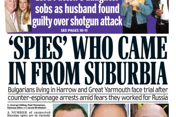The Daily Mirror highlights the arrest of Bulgarian nationals in the UK suspected of spying for Russia, showing an image of a bungalow where two of the alleged agents lived in North London.