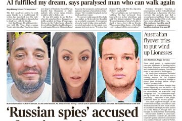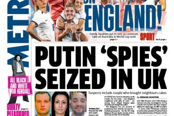 The Metro details the arrest of alleged Russian spies in the UK, identifying three of the accused and focusing on the police charges they face.