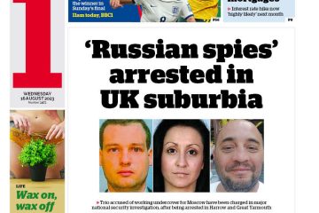 The i covers the arrests of three Bulgarian nationals in Britain accused of spying for Russia, detailing the forged documents they allegedly possessed.