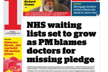 The i paper reports on Rishi Sunak attributing NHS waiting list backlog to doctors’ strikes, threatening his election pledge.