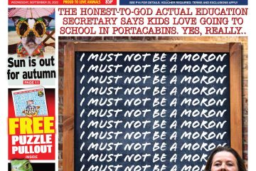 The Daily Star features the Education Secretary’s assertion that pupils relish lessons in portacabins.