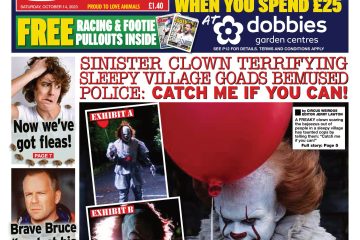 The Daily Star reports on a man in Scotland who, dressed as a clown, frightens villagers and challenges the police to apprehend him.