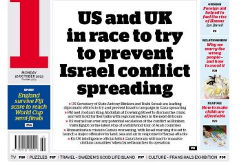 2023-10-16 i Front Page 16th of October 2023The i paper reveals US and UK’s diplomatic attempts to halt the spread of the Israel-Hamas conflict. By FindSales, 2 yearsOctober 15, 2023 ago