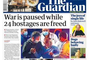 The Guardian’s front page highlights the temporary ceasefire between Israel and Hamas and the freeing of 24 Israeli captives.