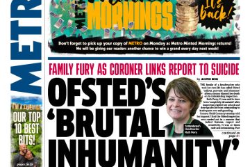 The Metro reports on a coroner’s verdict linking an Ofsted report to the suicide of headteacher Ruth Perry.