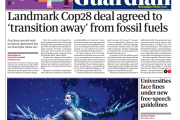 The Guardian leads with the story on the COP28 agreement to gradually eliminate fossil fuels, reached in Dubai.