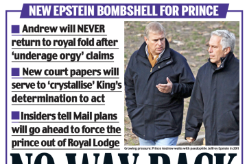 The Daily Mail reports that Prince Andrew’s royal return is unlikely following the release of court documents linked to Jeffrey Epstein.