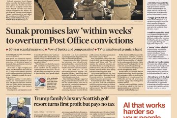 The Financial Times highlights Rishi Sunak’s pledge to enact a law to quash convictions from the Post Office Horizon scandal.