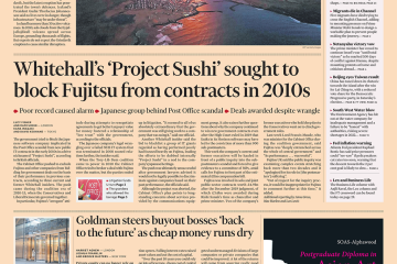 The Financial Times reports on the government’s attempt to bar Fujitsu, implicated in the Post Office scandal, from new public contracts in the early 2010s.