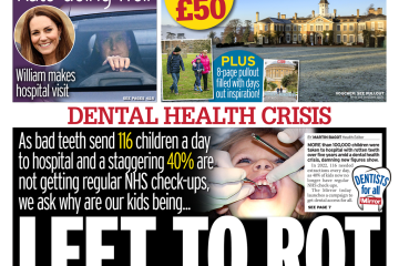 The Daily Mirror reports on the dental health crisis, with over 100,000 children hospitalised due to rotten teeth in five years.