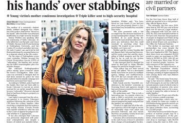 The Times reports on the mother of Barnaby Webber, a stabbing victim, accusing Nottinghamshire’s police chief of having “blood on his hands” following last summer’s triple murder.