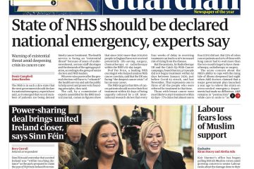 The Guardian leads with the alarming report by experts declaring the NHS a national emergency due to its critical condition.