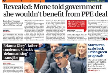 The Guardian’s front page features a fresh exposé on the Michelle Mone PPE scandal.