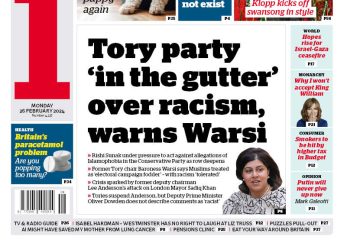 The i paper features Baroness Warsi accusing the Tories of racism and Islamophobia.