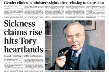 The Times reports a surge in sickness benefit claims across all constituencies, with notable increases in Tory strongholds like Tonbridge and Basingstoke.