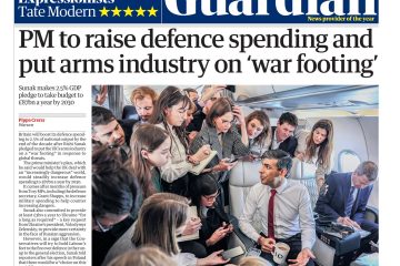 The Guardian reports Rishi Sunak’s commitment to supply Ukraine with a minimum of £3bn annually as part of his defence spending increase.