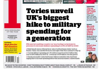 The Daily Telegraph highlights Rishi Sunak’s commitment to increase defence spending, as the Prime Minister moves the nation’s defence budget to a ‘war footing’