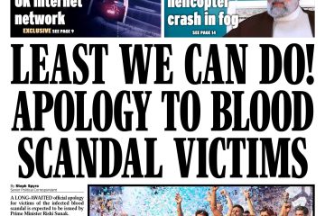 The Daily Telegraph reveals Rishi Sunak’s impending apology for NHS-infected blood scandal.