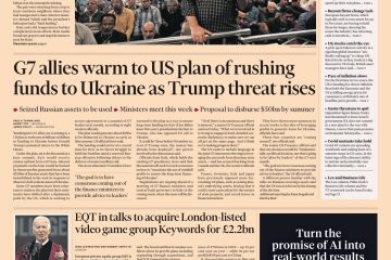 The Financial Times leads with the G7 nations’ inclination towards hastening aid to Ukraine amidst potential Trump triumph.