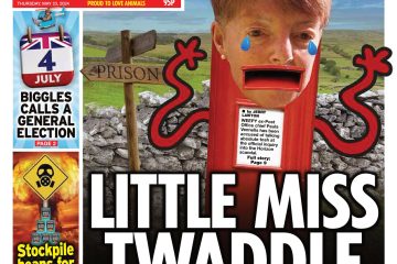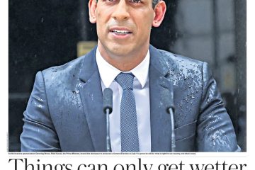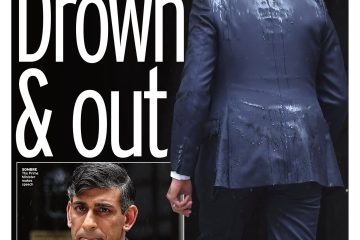 The Daily Mirror’s front page features a drenched Rishi Sunak post-election announcement, dubbing the prime minister as “drown and out”.