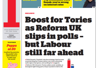 The i reports a two-point rise for the Conservatives in the polls, while Reform has slightly declined, yet Labour maintains a strong lead.