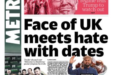 A London market trader whose photo featured on a “Welcome to Heathrow” poster suffered racist abuse online. He chose conciliation, inviting detractors to share dates at his stall, stressing dialogue, hospitality and forgiveness over hostility.
