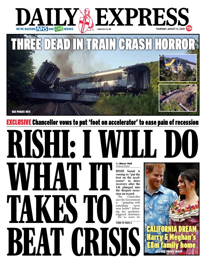 The Daily Express claims a front page exclusive as it leads on a vow by Chancellor Rishi Sunak to “put the foot on the accelerator” to drive economic recovery after the UK sank into the deepest recession on record.