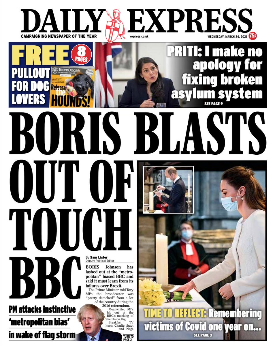 Boris Johnson has “lashed out at the metropolitan biased BBC”, according to the Daily Express. It says he made the comments to Tory MPs, telling them that the broadcaster must learn from its failures over Brexit when it was “pretty detached” from a lot of the country.