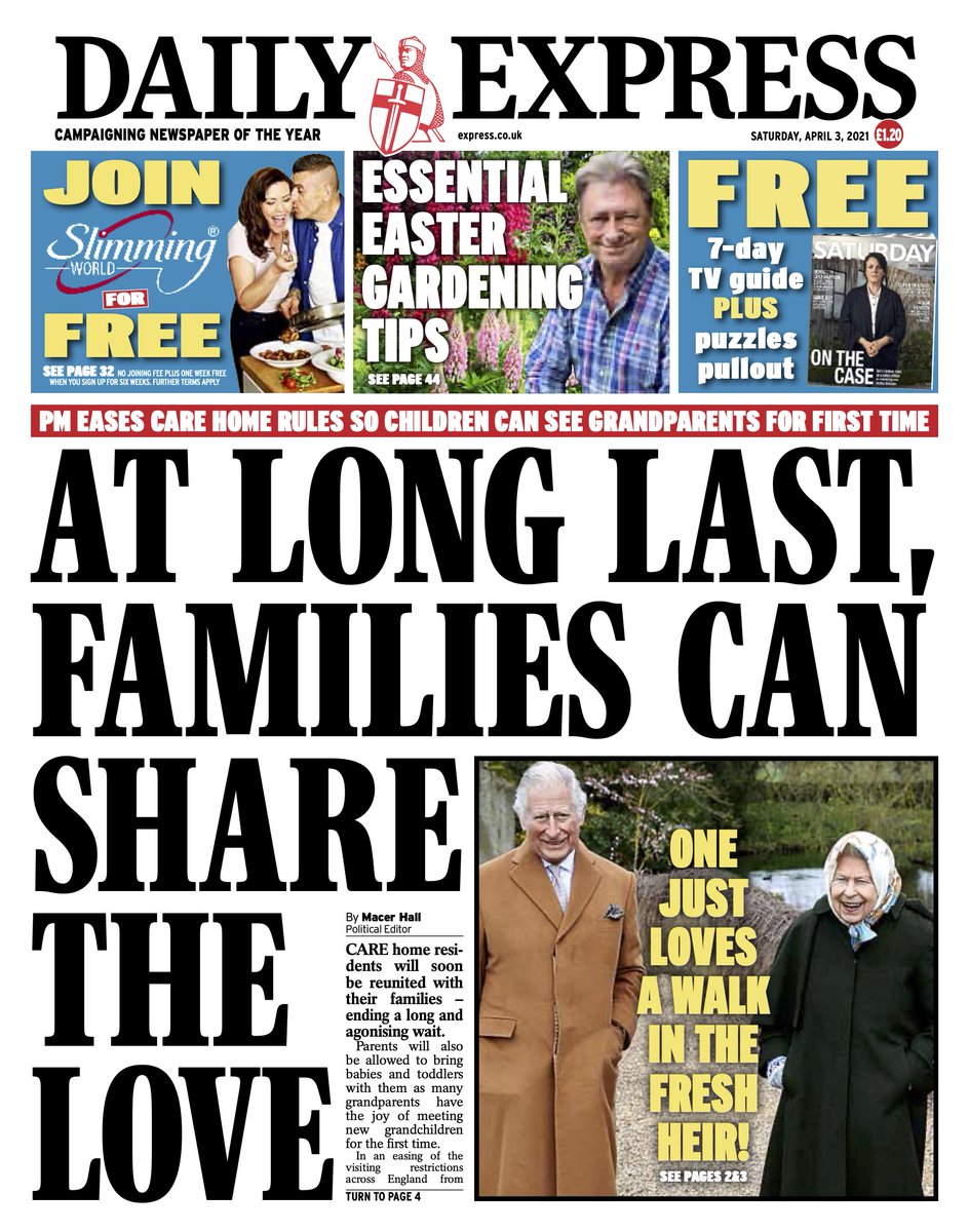 The Daily Express leads with the news that care home residents in England will be able to see grandchildren for the first time in months. From 12 April, people in care homes are to be allowed a second regular indoor visitor. Babies and young children can also attend.