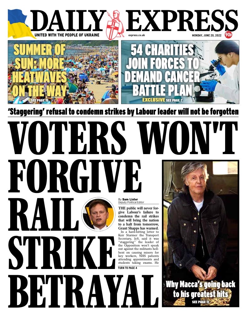 “Voters won’t forgive rail strike betrayal” says the Express, paraphrasing the transport secretary. The paper says Grant Shapps has written a hard-hitting letter to the Labour leader Sir Keir Starmer, saying it was staggering that he would not speak out against the strike.