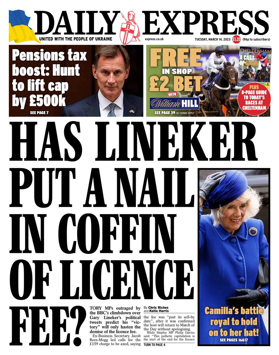 The Express asks whether the affair has “put a nail in the coffin of the licence fee”. It says former business secretary Jacob Rees-Mogg has labelled the BBC’s funding model “past its sell-by date” and quotes Philip Davies, also a Tory MP, saying the row is the “start of the end” for the fee.